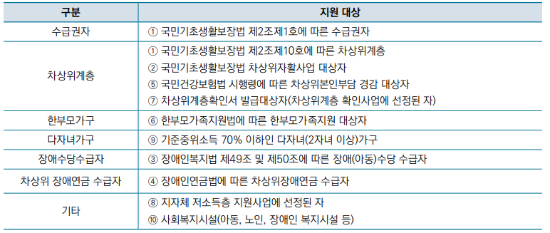 저소득층, 다자녀 가구, 사회복지시설 등 지원대상임을 증명하는 서류가 필요합니다. 예를 들어, 수급자증명서 (저소득층), 건강보험료 납부 확인서 (다자녀 가구), 가족관계증명서 등이 있습니다.