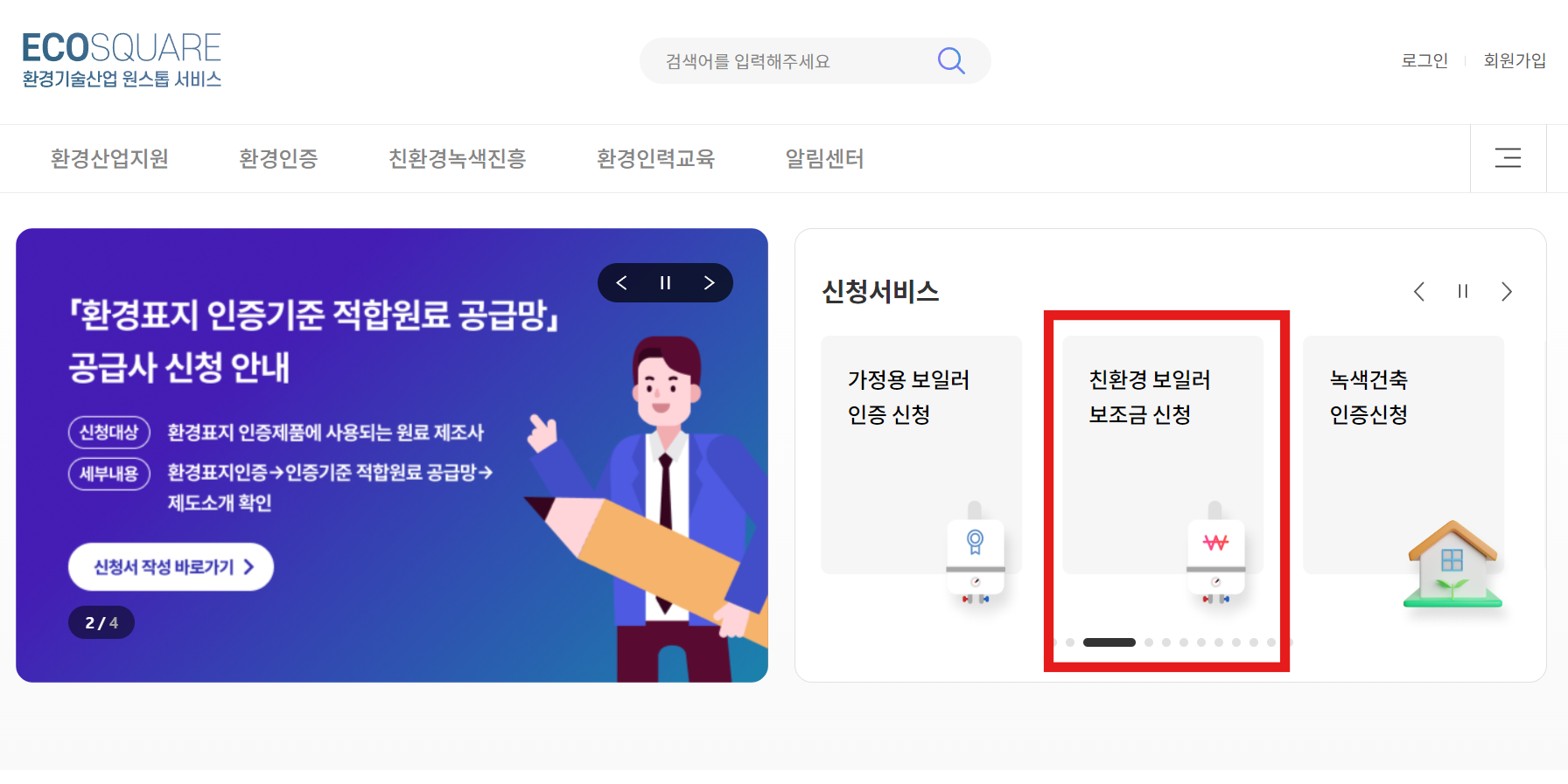 온라인 가능여부를 확인하셨다면, 에코스퀘어 홈페이지에서 '친환경 보일러 보조금 신청'을 클릭하여 로그인 한 뒤 절차를 따르면 됩니다.