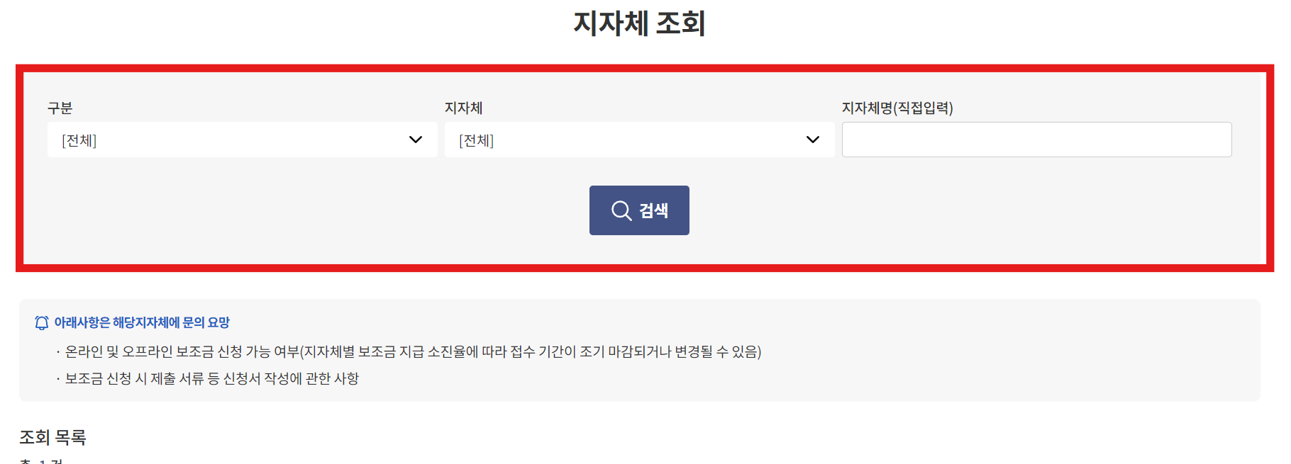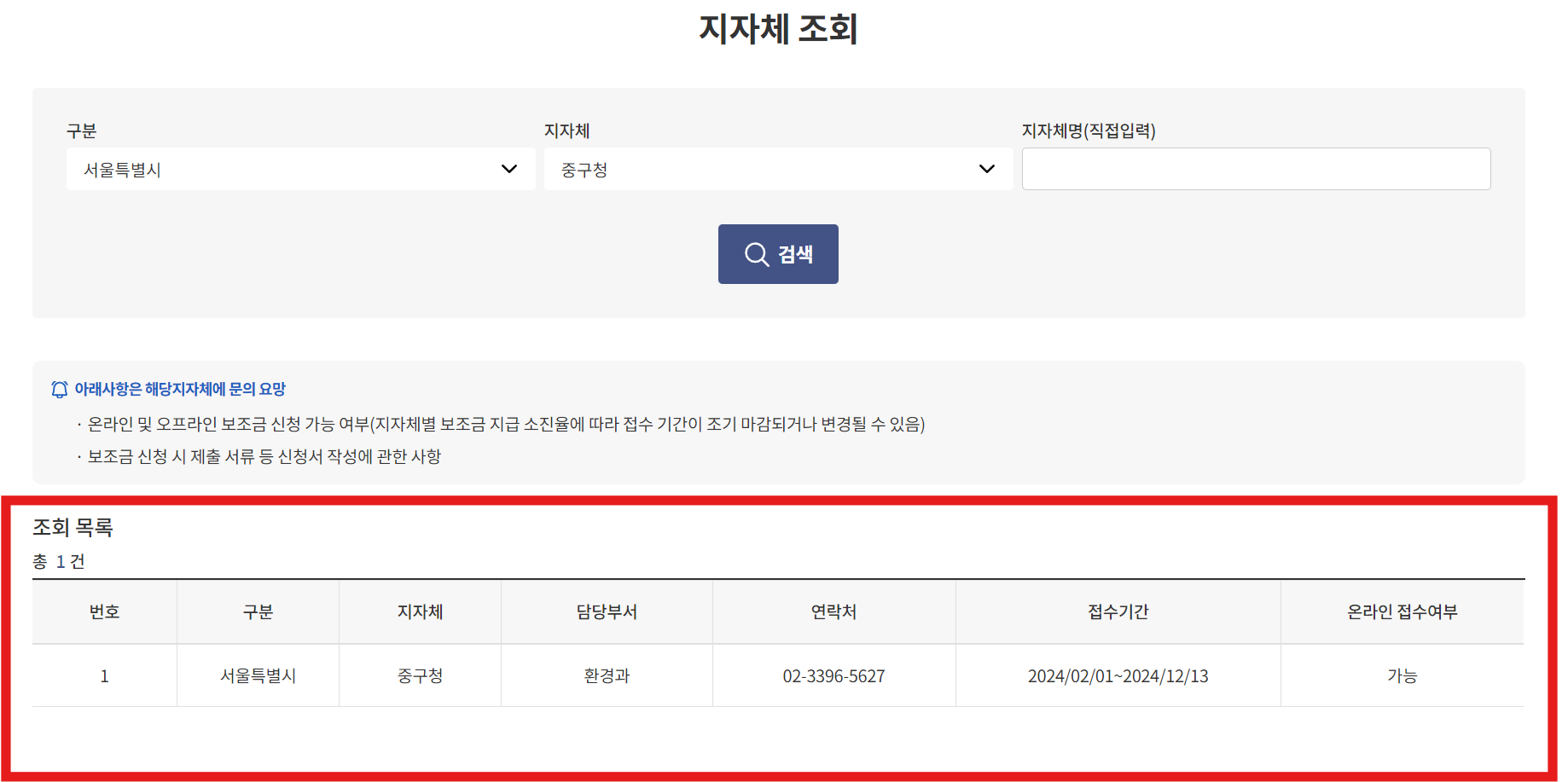 예를들어, 아래 지자체 조회에서 '서울특별시 - 종로구'를 선택한다면, '온라인 접수 여부'를 확인할 수 있습니다.