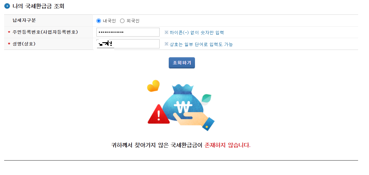 로그인 할 필요 없이 주민등록번호나 사업자등록번호를 입력 후, 성명이나 상호명을 입력하면 바로 결과를 볼 수 있습니다. 저의 경우 아래와 같이 '귀하께서 찾아가지 않은 국세환급금이 존재하지 않습니다.'라는 화면이 뜨네요.