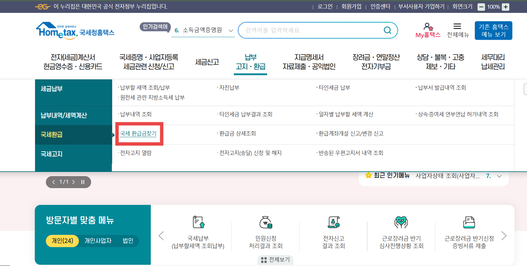 홈택스에 접속한 후, '국세 환급금 조회' 메뉴를 선택하세요.