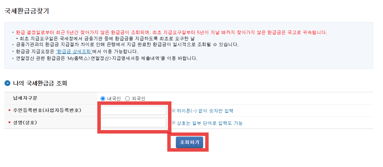 이곳에서 여러분의 개인 정보를 입력하면 미수령 환급금이 있는지 확인할 수 있습니다.