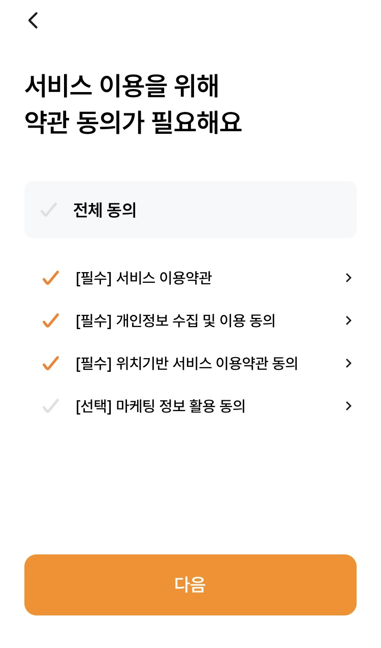 요새 사이트나 앱은 카카오계정이나 네이버로도 간편하게 로그인 가능합니다. 저는 아이폰이다 보니 '애플 아이디로 로그인하기'도 뜨고 있습니다. 서비스 약관 동의에 필수 부분은 반드시 체크해 주시고 넘어가시면 됩니다. 저는 행여나 광고 메시지 자주 올까 봐 마케팅 정보 활용 동의하기에는 클릭 잘 안 합니다.