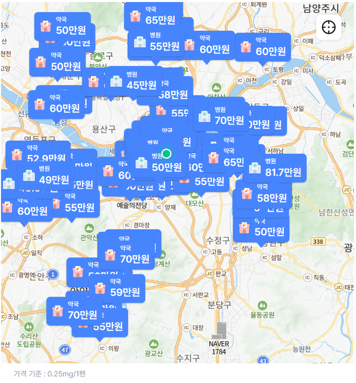 링크 클릭하셔서 지도를 이동해 보세요. 대략 40만원대부터 시작하고 있네요. 원하는 지역의 병원이나 약국 중에 아무 곳이나 클릭해서 들어가 보시면, '최저가 비대면 진료받기'라는 창이 보입니다. 그곳을 누르면, 앱 설치 후에 로그인을 하고, 비대면 진료를 이용할 수 있어요.