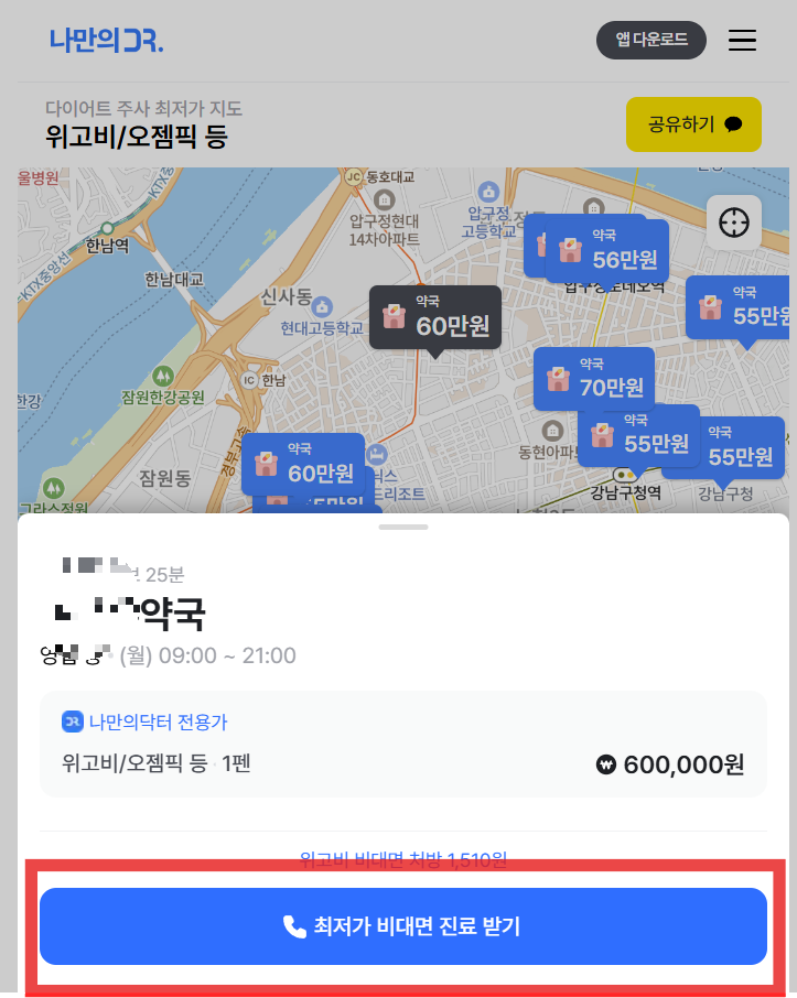 '나만의 닥터' 앱에 들어가시면, 아래와 같이 근처 병원이나 약국에서 파는 위고비의 가격을 비교할 수 있습니다.