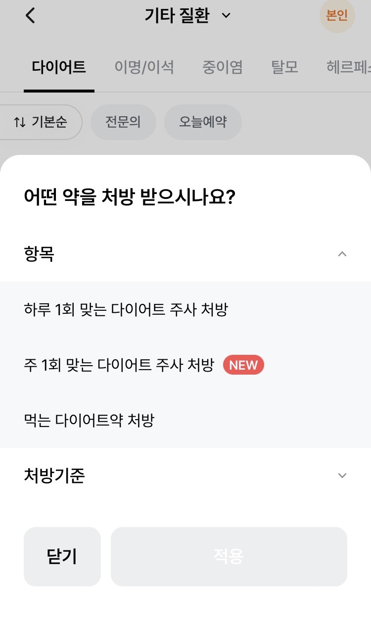 '증상'에서 '기타질환' 중, '다이어트'로 들어갑니다. 그러면 오른쪽과 같은 화면이 뜨는데, 여기서 항목 중, '주 1회 맞는 다이어트 주사 처방'을 누릅니다. 그러면, 위고비를 처방해줄 수 있는 의사들이 뜨게 됩니다. 주요 진료과는 가정의학과나 내과이지만 이비인후과, 성형외과 등의 의사들도 쉽게 볼 수 있습니다. 이 중 진료비, 별점 등 내가 원하는 기준을 설정하면, 해당 기준에 따라 우선순위 별로 볼 수 있게 되어 있어요. 원하는 의사를 선택하면, 진료를 볼 수 있습니다.