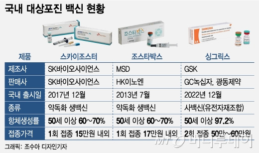 특징: 이 백신은 재조합 방식으로 만들어져 면역 반응을 더욱 강하게 유도합니다. 2회 접종이 필요하며, 18세 이상의 면역력이 약한 사람들 (예: 자가조혈모세포이식자, 고형암 환자, 혈액암 환자, 고형장기 이식 환자 등)에게 특히 권장됩니다.