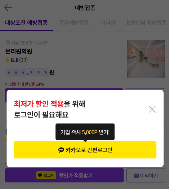내 주변 병원의 접종 비용을 비교할 수 있고 첫 로그인 시 카카오톡을 통해서 하면, 5,000P를 즉시 받을 수 있어요.