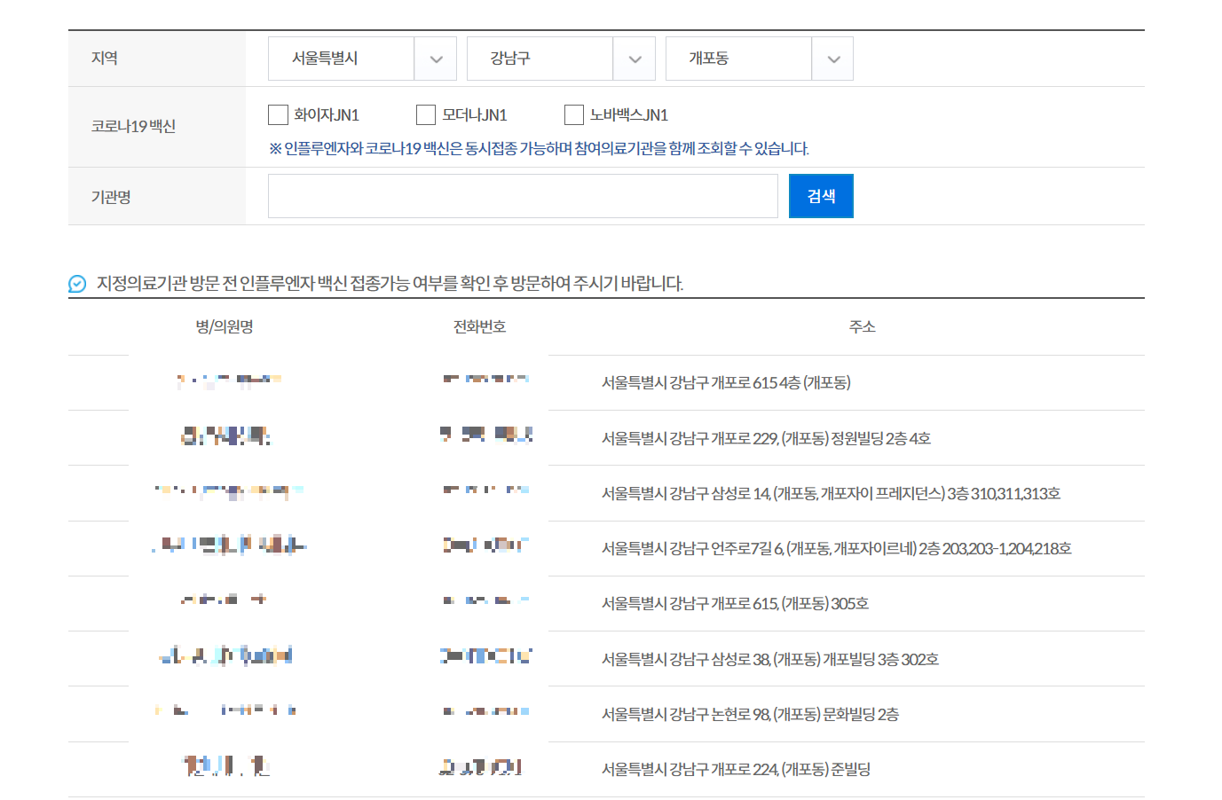 예를 들어, 지역을 서울시 강남구 개포동이라고 검색해 보면 아래와 같이 예방접종 받을 수 있는 기관들이 뜹니다.