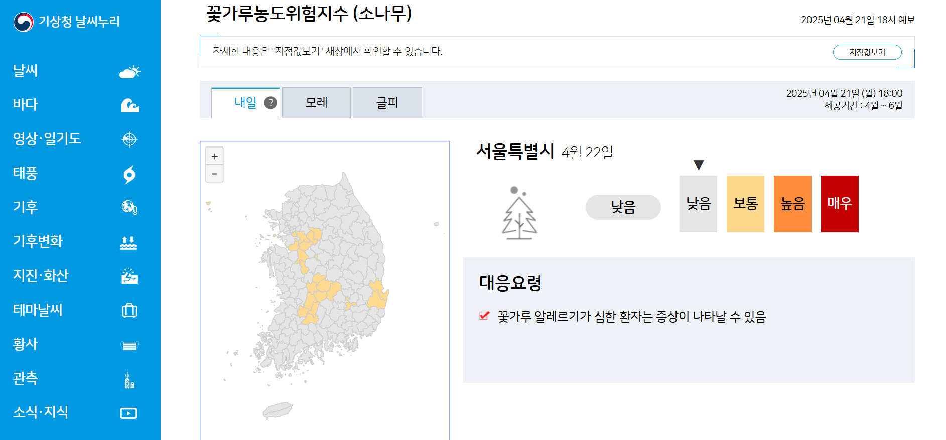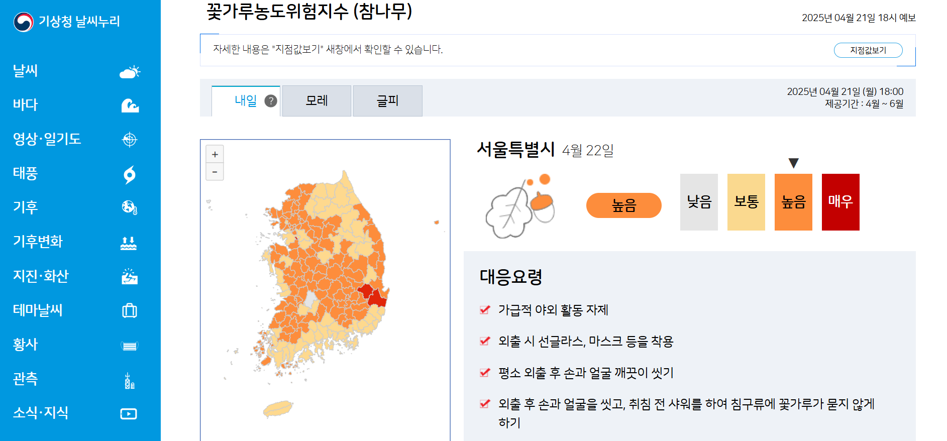 기상청의 꽃가루 농도 예보는 아래 링크에서 확인하실 수 있습니다: