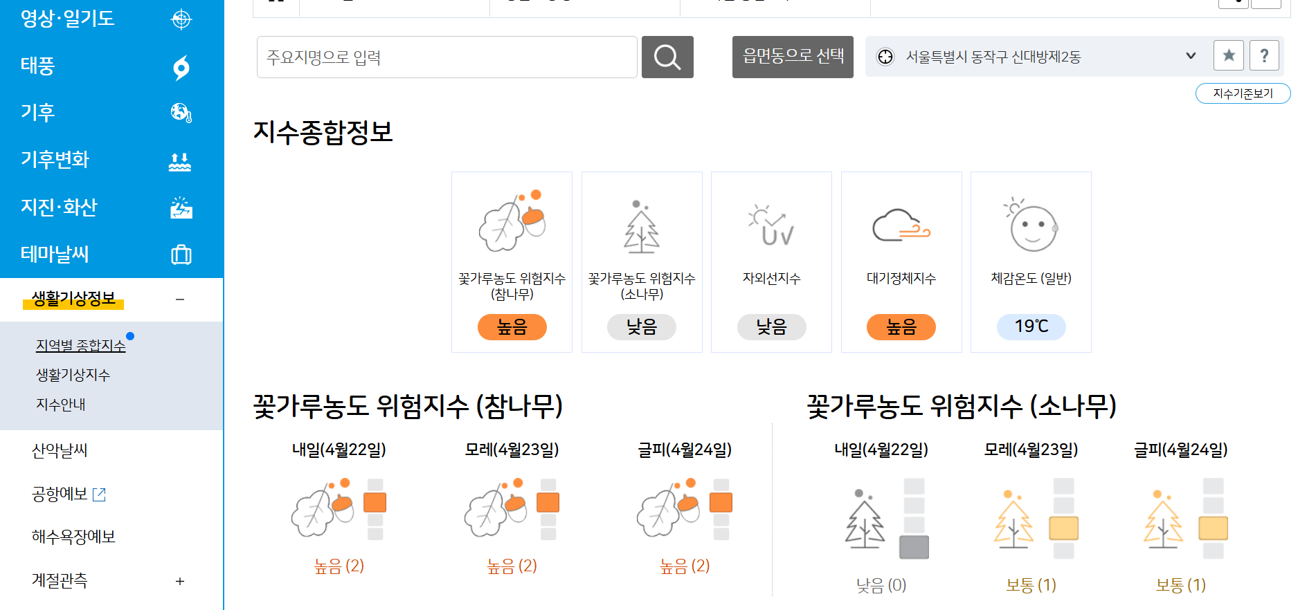 좌측 메뉴에서 [테마날씨 - 생활기상정보 - 지역별 종합지수]를 선택하면, 꽃가루농도 위험지수와 자외선지수, 대기정체지수, 체감온도까지 한 눈에 확인하실 수 있습니다.