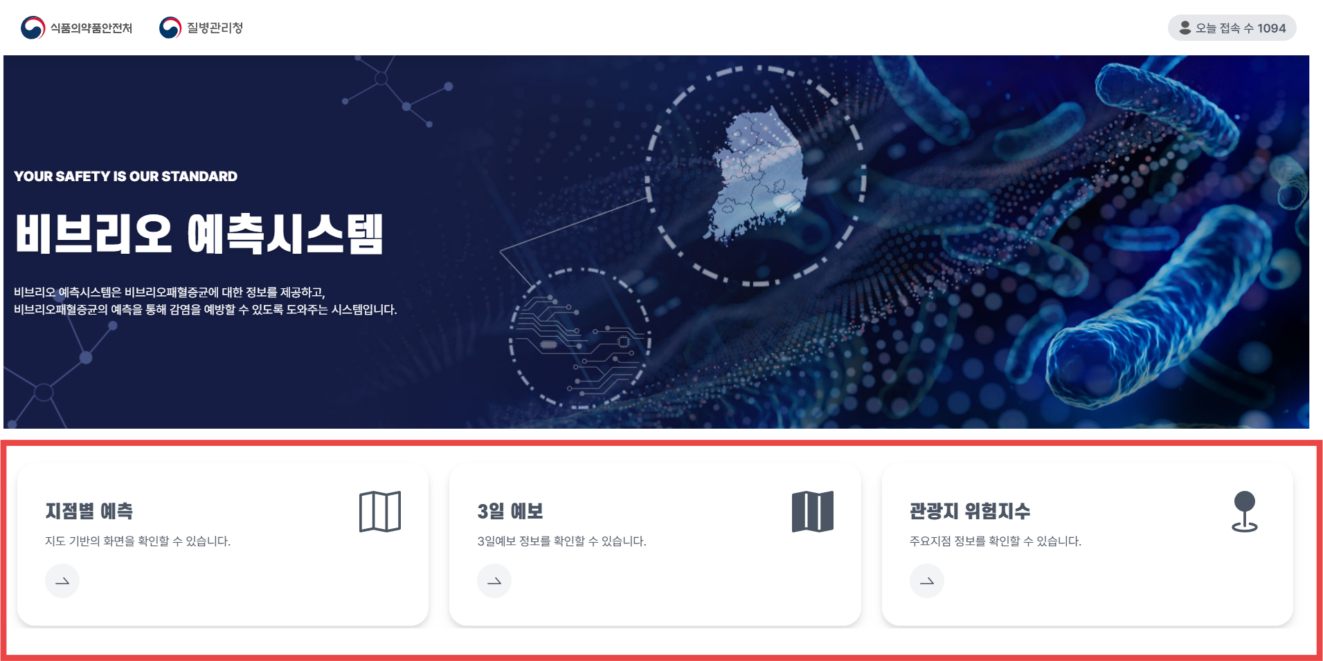 식품의약품안전처에서 운영하는 '비브리오 예측 시스템'은 비브리오 패혈증균의 발생 가능성을 미리 예측하여 알려주는 매우 유용한 도구입니다. 홈페이지 들어가 보시면, 아래와 같은 창을 통해 비브리오 패혈증균에 대한 정보를 확인할 수 있습니다.
