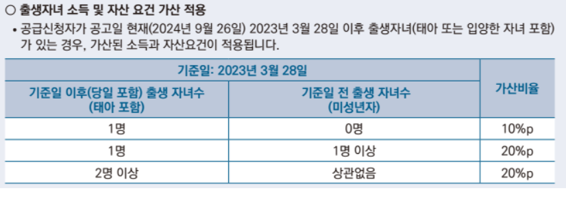 공급신청자가 공고일 기준(2024년 9월 26일) 2023년 3월 28일 이후 출생자녀(태아 또는 입양한 자녀 포함)가 있다면, 가산된 소득과 자산요건이 적용되며 이에 따른 추가 서류접수가 필요할 수 있습니다.