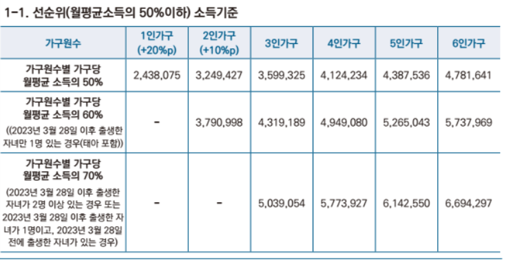 - 전용면적 50㎡ 미만 주택 : 가구원 수별 월평균 소득 50% 이하 (1인 가구는 70% 이하, 2인 가구는 60% 이하)