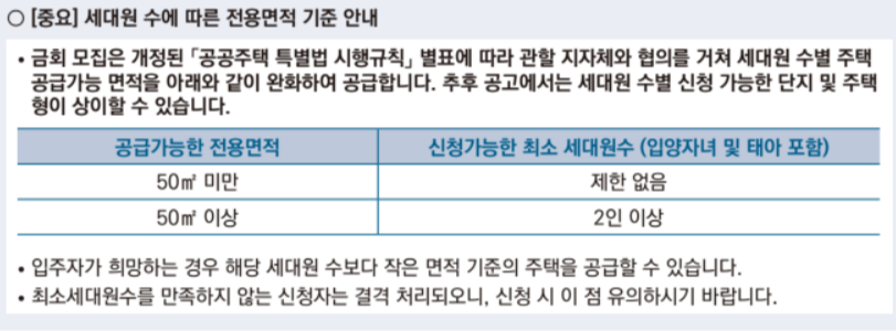 세대원 수에 따른 전용면적 기준 안내이번 모집에서는 세대원 수별 주택 공급가능 면적을 아래와 같이 완화하여 공급합니다.